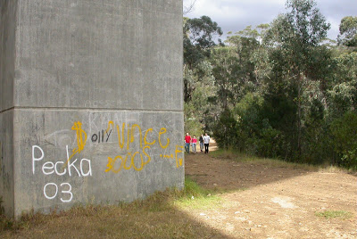 Ten points if you can name the highway this concrete pylon supports, fifteen points if you can name the artist who has used it as a canvas, and a fifty point jackpot (!) if you can name the Australian performance art troupe posing in the background.